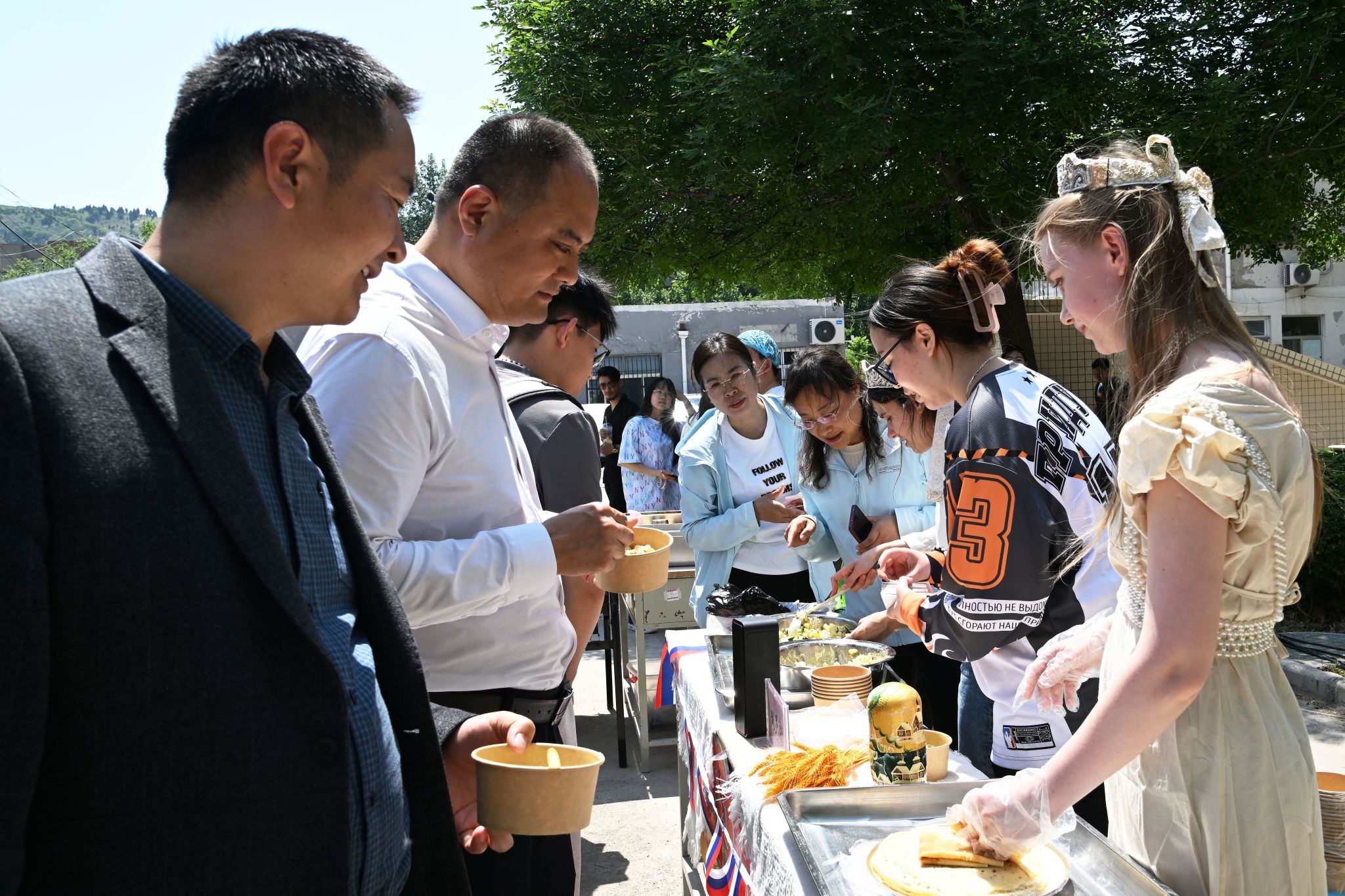 中亚文化展区由吉尔吉斯斯坦与塔吉克斯坦联合打造,“手抓饭”与“烤包子”生动诠释丝绸之路上传承千年的饮食文化;中欧展区匈牙利国际员工带来特色美食“酸奶油鸡肉炖”,搭配手工面疙瘩,以及传统甜点“苹果派”,酥脆饼皮包裹肉桂苹果馅,佐以香草奶油酱,展现地道风味;东欧展区以俄罗斯为主题,展示了“俄式传统薄煎饼”,搭配酸奶油的经典吃法令人回味无穷;南亚展区则展示了巴基斯坦饮食文化的多元融合特质,既有本土风味的“蔬菜咖喱沙拉”与“恰巴提烤饼”,更特别呈献消暑饮品“薄荷香蜜饮”,清凉沁脾,展现了南亚独特的饮品智慧。